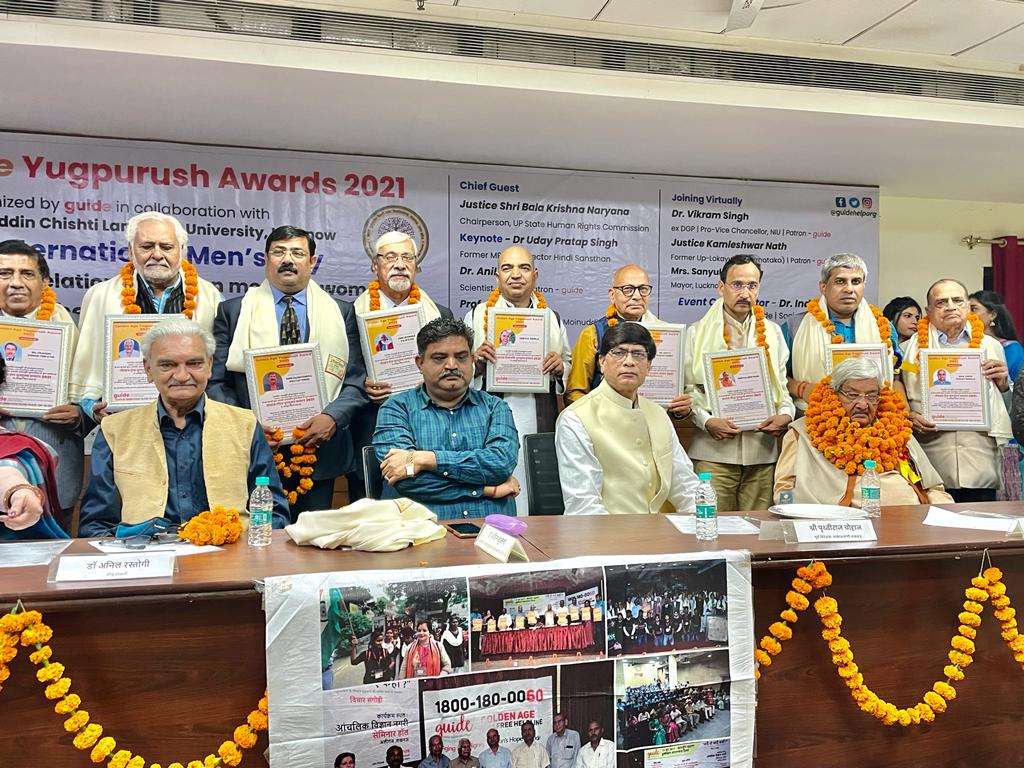 लखनऊ | आज गाइड समाज कल्याण संस्थान द्वारा अंतरराष्ट्रीय पुरुष दिवस के अवसर पर ख्वाज़ा मुइनुद्दीन चिश्ती भाषा विश्विद्यालय के सह तत्वावधान में समाज के पुननिर्माण में अपना अमूल्य योगदान देने वाले पुरुषों को गोल्डन एज युगपुरुष सम्मान अलंकरण समारोह का आयोजन किया गया । समारोह के मुख्य अतिथि न्यायमूर्ति श्री बाल कृष्ण नारायण जी थे । अलंकरण कार्यक्रम की अध्यक्षता हिंदी के मूर्धन्य विद्वान, पूर्व सांसद, हिन्दी संस्थान उत्तर प्रदेश के पूर्व अध्यक्ष डॉ उदय प्रताप सिंह ने की ।