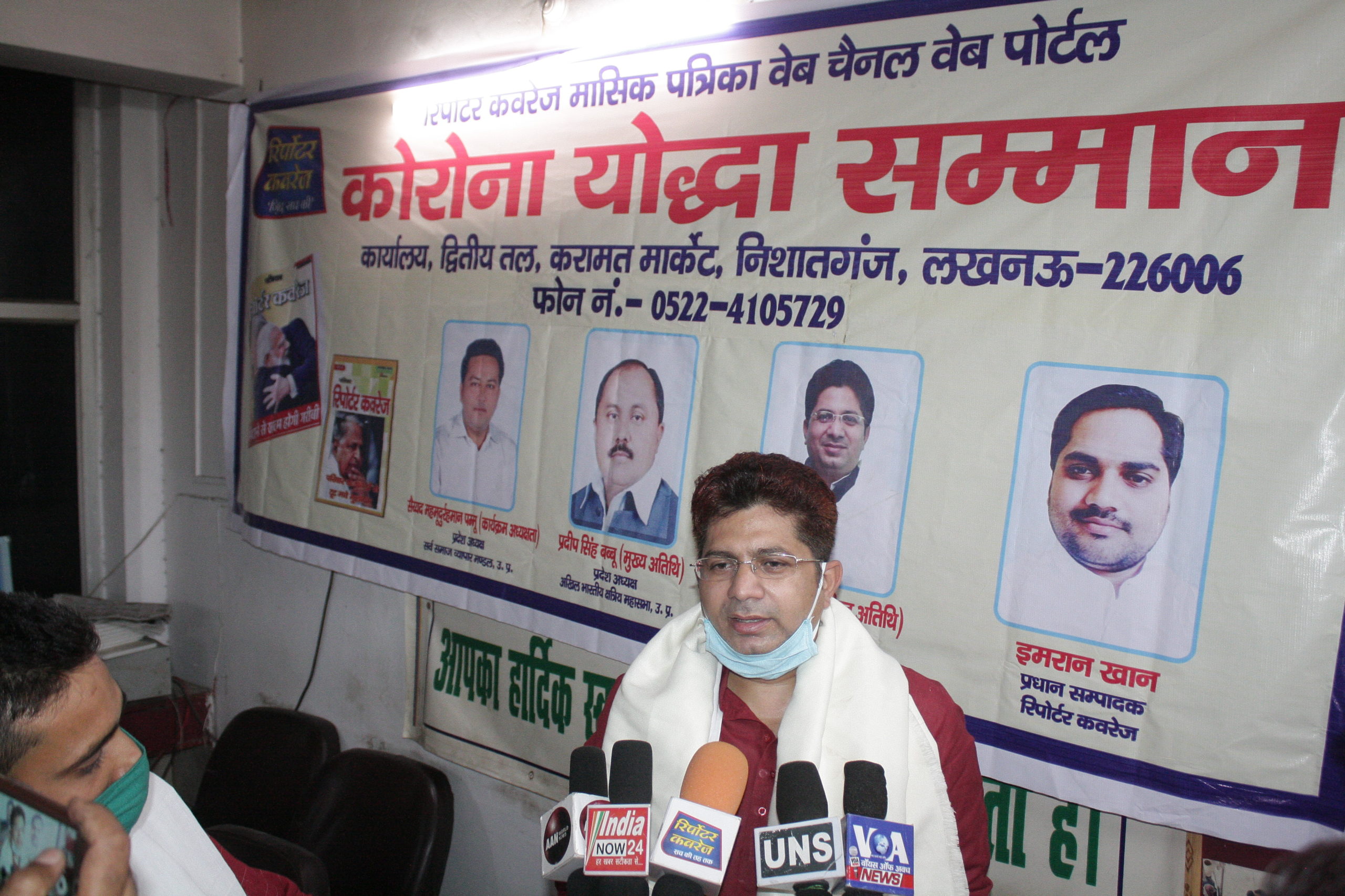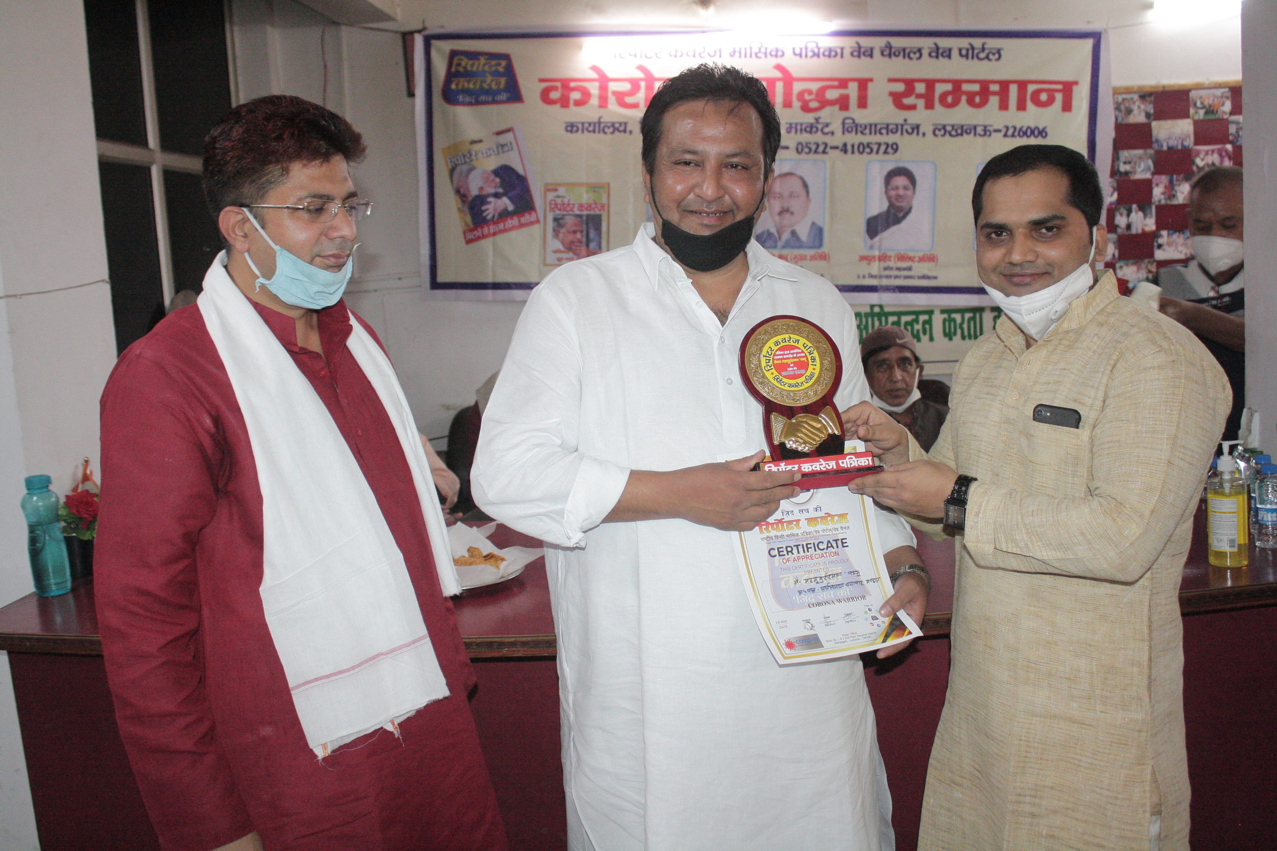 लखनऊ। राष्ट्रीय मासिक पत्रिका एवं वेब पोर्टल रिपोर्टर कवरेज ने करामत मार्केट निशातगंज में आयोजित एक कार्यक्रम में कोरोना योद्धा सम्मान के अंतर्गत पत्रकारो, छायाकारो, पुलिसकर्मियों,डॉक्टरों एवं समाजसेवियों को उनकी उल्लेखनीय सेवाओं के लिए सम्मानित किया। कार्यक्रम की अध्यक्षता रिपोर्टर कवरेज़ की ओर से आयोजित