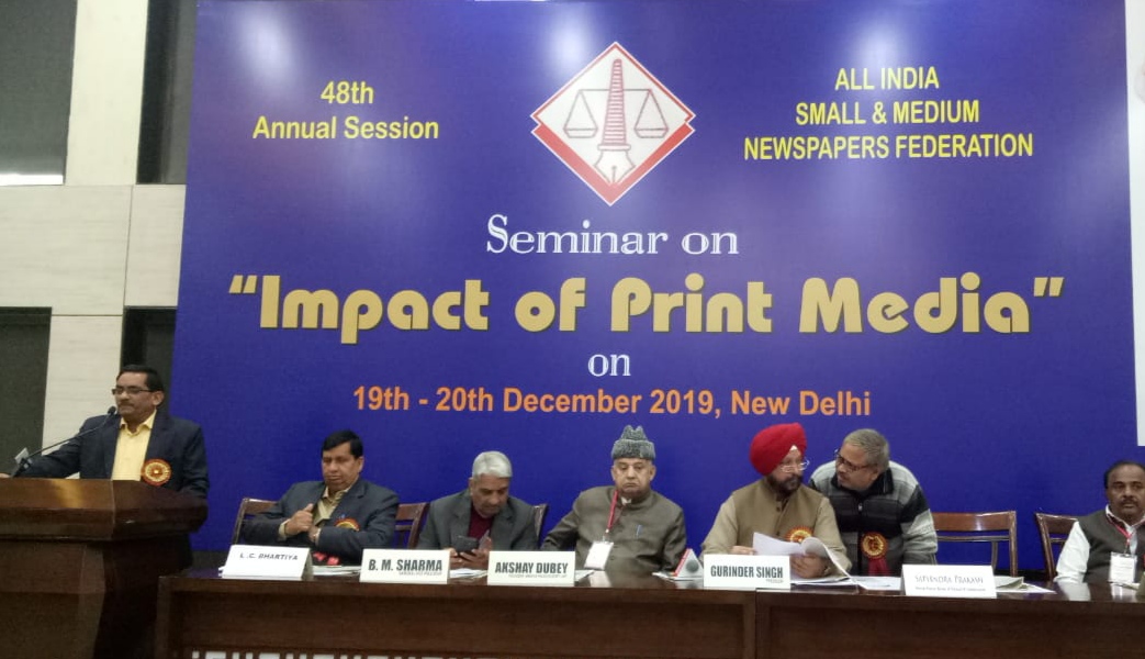 नई दिल्ली :लखनऊ। वर्तमान के बदलते परिवेश में प्रिंट मीडिया की महत्ता को कम नहीं समझा जा सकता। इसी लिए देश के छोटे व मझौले अखबारों की भूमिका को भी नजरंदाज नहीं किया जा सकता। उक्त विचार डीएवीपी के महानिदेशक सत्येन्द्र प्रकाश ने आल इन्डिया स्माल एंड मीडियम न्यूज पेपर्स फ़ेडरेशन के दिल्ली के कंस्टीट्यूशन क्लब में फेडरेशन के आयोजित दो दिवसीय 48 वें राष्ट्रीय अधिवेशन में देश भर से आए सैकड़ों छोटे एवं मझौले समाचार पत्रों के प्रकाशकों को संबोधित करते समय व्यक्त किए।