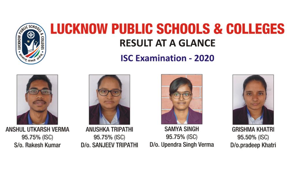 आज दिनांक 10.07.2020 को आई.सी.एस.ई./आई.एस.सी. का परीक्षा परिणाम घोषित हुआ। आईसीएसई परीक्षा-2020 में 848 एवं आईएससी में 727 छात्र/ छात्रायें सम्मिलित हुए। लखनऊ पब्लिक स्कूल्स एण्ड काॅलेजेज़ के आई.सी.एस.ई. परीक्षा में 74 विद्यार्थियों ने 95 प्रतिशत से अधिक अंक तथा 226 विद्यार्थियों ने 90 प्रतिशत से अधिक तथा 497 विद्यार्थियों ने 80 प्रतिशत से अधिक अंक प्राप्त किये। आई.एस.सी. परीक्षा में 29 विद्यार्थियों ने 95 प्रतिशत से अधिक अंक तथा 115 विद्यार्थियों ने 90 प्रतिशत से अधिक तथा 265 विद्यार्थियों ने 80 प्रतिशत से अधिक अंक प्राप्त किये।