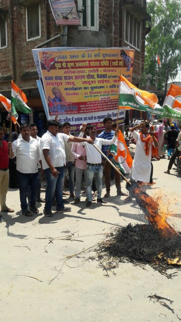 फैजाबाद:-देवरिया के बालिका एवं नारी संरक्षण ग्रह में कथित वैश्या वृत्ति मामले को लेकर कांग्रेसियों का गुस्सा फूट पड़ा।युवा कांग्रेस के लोक सभा अध्यक्ष् रणजीत सिंह व् जिला कांग्रेस के संगठन मंत्री व् रूदौली नगर के प्रभारी तारिक रुदौलवी के नेतृत्व में कार्यकर्ताओं ने रुदौली के कटरा तिराहे पर मुख्यमंत्री का पुतला फूंक कर विरोध जताया।