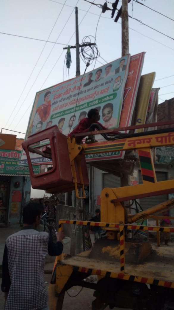 रुदौली। आचार संहिता लगते ही अलर्ट हुआ रुदौली तहसील प्रशासन। नगर से लेकर गांवों तक में लगी होर्डिंग्स बैनर पोस्टर को हटवा रहा प्रशासन। नगर पालिका के कर्मचारी जुटे होर्डिंग्स पोस्टर और बैनर हटाने में। एसडीएम ज्योति सिंह और सीओ धर्मेंद्र यादव हुए सक्रिय। कोतवाल विश्वनाथ यादव ने भी मातहतों को जारी किए निर्देश।