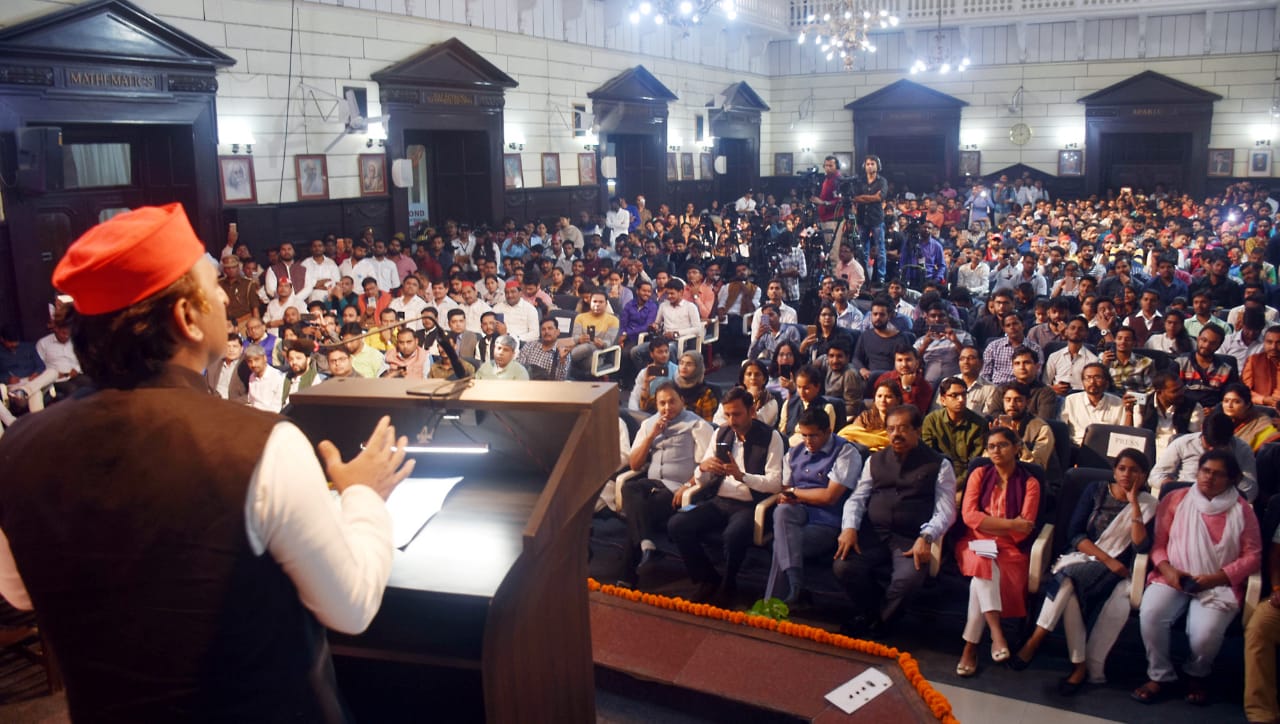 अखिलेश यादव आज ‘फेकन्यूज‘ पर लखनऊ विश्वविद्यालय में आयोजित संवाद में अपने विचार व्यक्त कर रहे थे