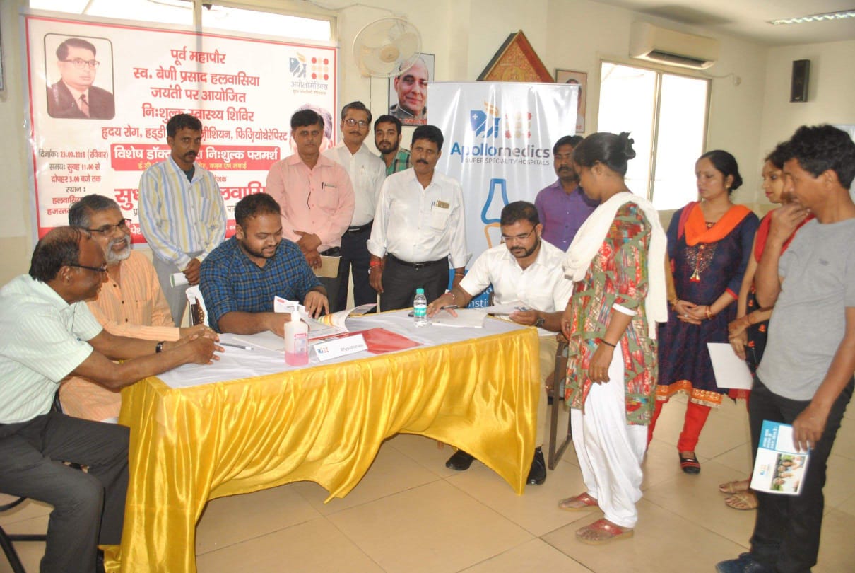 सुधीर एस. हलवासिया द्वारा अपोलो मेडिक्स स्पेशिएलिटी हास्पिटल के तत्वाधान में आयोजित इस स्वास्थ्य शिविर में विशेषज्ञ डाक्टरों द्वारा रोगियों को न सिर्फ निःशुल्क परामर्श दिया गया बल्कि ई.सी.जी., ब्लड शुगर, ब्लड प्रेशर आदि की निःशुल्क जांच की गयी तथा दवा वितरण भी किया गया ।
